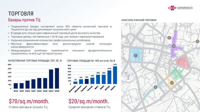 В сегменте торговой недвижимости Соколов отметил значительный разрыв между объектами разного уровня. По его словам, Tashkent City Mall остаётся единственным торговым центром с высокими стандартами управления, где арендная ставка достигает 70 долларов за квадратный метр. В обычных ТЦ она находится на уровне 20 долларов.