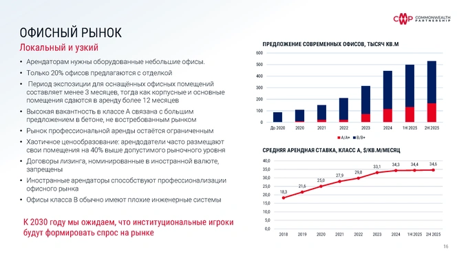 Приводя данные по арендным ставкам, эксперт отметил, что заявленные владельцами офисных зданий цены часто отличаются от фактических. Формально арендная ставка для офисов класса А может озвучиваться на уровне около 60 долларов за квадратный метр в месяц, однако реальные сделки, как правило, заключаются в диапазоне 35−40 долларов. Иностранные консультанты ориентируются на заявленные ставки, что приводит к неверным ожиданиям инвесторов.