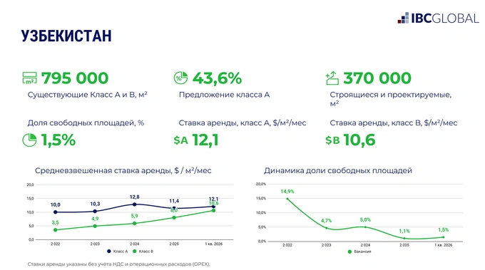 На сегодня рынок складской недвижимости Узбекистана характеризуется критическим дефицитом качественных площадей. Согласно данным IBC Global, по состоянию на первый квартал 2026 года в Узбекистане насчитывается 795 тысяч кв. м складов классов A и B. При этом уровень вакантности (свободных площадей) равен 1,5%.