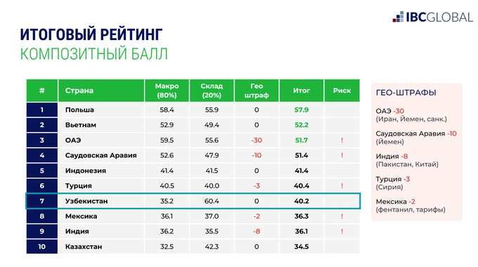 По показателю складской вакантности Узбекистан получил в рейтинге IBC Global 60,4 балла. Это самый высокий показатель среди топ-10 стран мира с наибольшим потенциалом развития, отмечает Ахмедзянов. В то же время цифры говорят о дефиците качественного предложения.