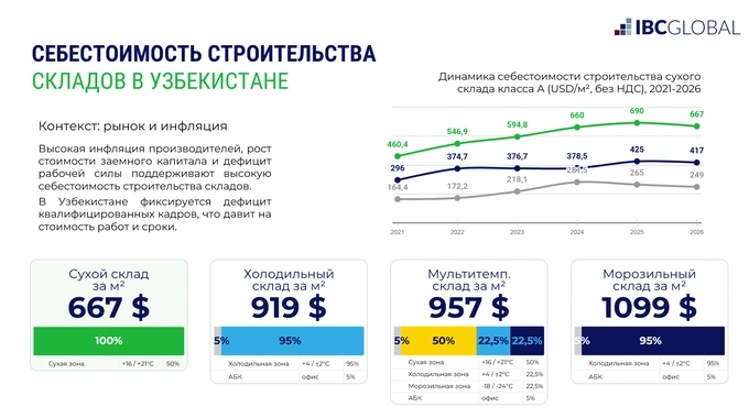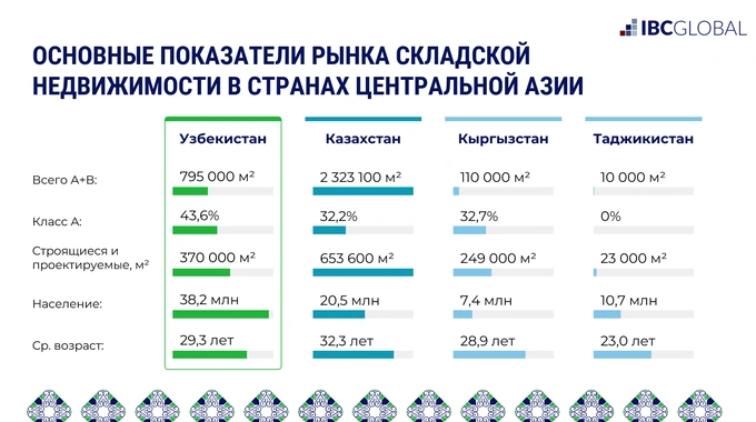 Средний возраст складов в Узбекистане составляет 28,9 лет, что указывает на преобладание устаревшего фонда. В стадии строительства находится 370 тысяч кв. м новых площадей.