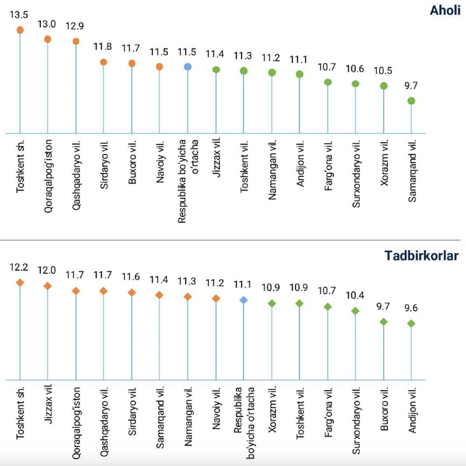Высокие ценовые ожидания зафиксированы также у жителей Каракалпакстана (13%) и Кашкадарьинской области (12,9%), самые низкие — в Самаркандской области (9,7%).