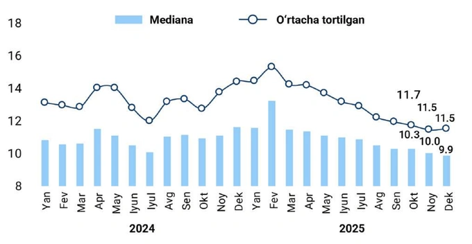 В декабре инфляционные ожидания населения Узбекистана на следующие 12 месяцев перестали снижаться и сохранились на уровне 11,5%, тогда как у бизнеса ожидания ухудшились до 11,1% (+0,6 п. п.). Это следует из опросов Центрального банка.