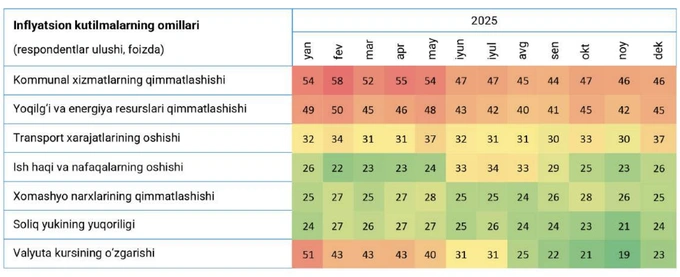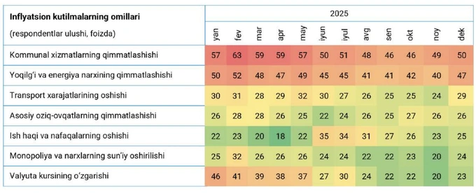 Наивысшие инфляционные ожидания в Узбекистане — у пенсионеров (12,9%), самые низкие — у студентов (9,5%).