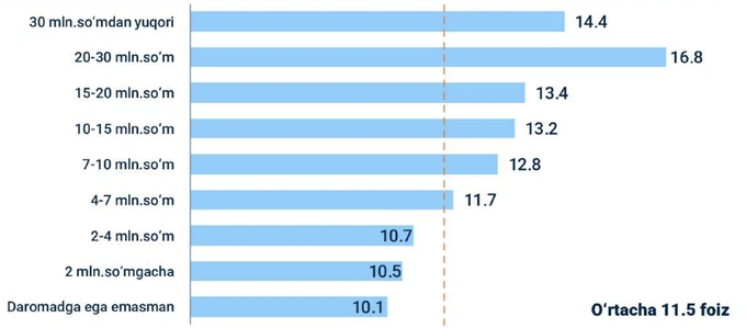 Инфляционные ожидания ухудшились у граждан с доходами до 2 млн сумов, 2−4 млн, 7−10 млн, а также 15−20 млн и 20−30 млн сумов.