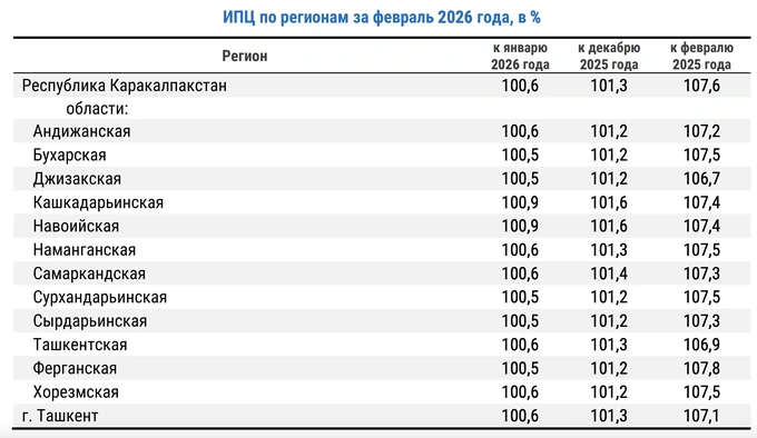 Самые высокие темпы месячной инфляции зафиксированы в Навоийской и Кашкадарьинской областях (0,9%). В годовом выражении показатель показал наибольший рост в Ферганской области (7,8%) и Каракалпакстане (7,6%).