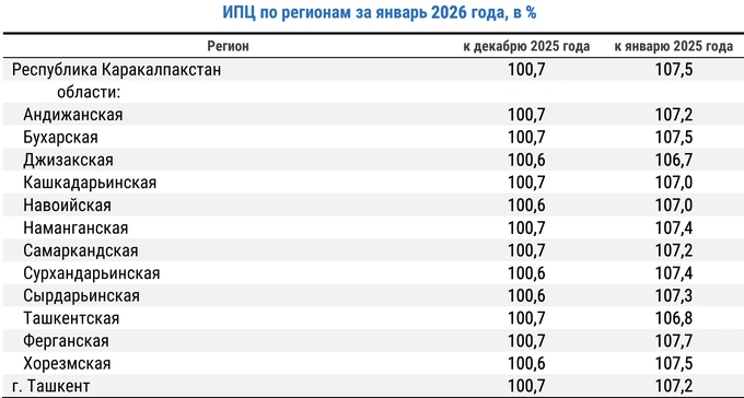 Инфляция в Узбекистане в январе 2026 года составила 0,7% (по новой формуле — 0,6%), следует из данных Национального комитета по статистике.