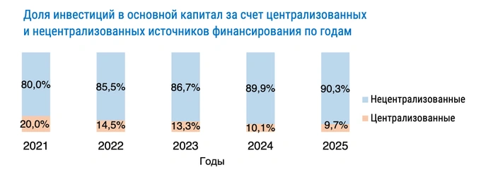 Объем средств из централизованных источников (государственный бюджет и госпрограммы) вырос до 43,4 трлн сумов — на 11,9%. Однако их доля в общей структуре немного сократилась, с 10,1% до 9,7%. Власти, по оценкам экспертов, стараются сохранять баланс: поддерживать инфраструктурные проекты, не увеличивая при этом бюджетную нагрузку.