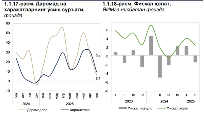 В этом году доходы государственного бюджета, в основном благодаря росту цен на золото, растут быстрее расходов, однако динамика бюджетных расходов также заметно ускорилась. В частности, доходы государственного бюджета за девять месяцев выросли на 20,6% в годовом выражении (в аналогичном периоде 2024 года — 19%), тогда как расходы — на 20,5% (годом ранее — 9%).