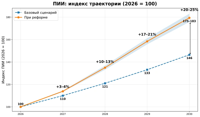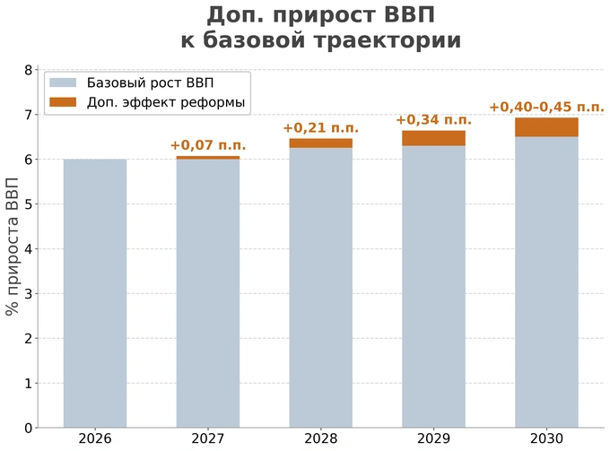 Если к прямой экономии добавить сокращение правовой неопределённости, рост предсказуемости и снижение трансакционных издержек, то дополнительный вклад реформы в базовый рост ВВП можно сценарно оценивать в диапазоне 0,15−0,4% в год после её полного развёртывания.