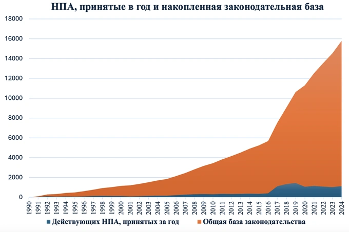 Количество ежегодно утверждаемых НПА и динамика роста общей базы законодательства.