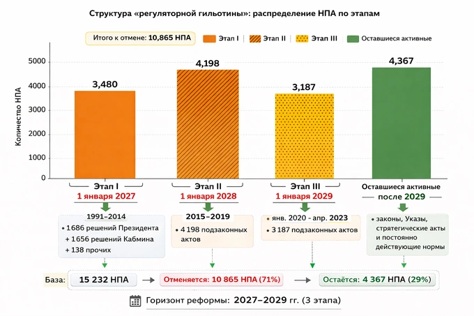 По предварительной авторской оценке, речь может идти о поэтапной отмене до 10 865 подзаконных актов — за вычетом белого списка. Это около 71% опубликованного массива. Реформу целесообразно запускать с заранее объявленными датами вступления в силу, например 1 января 2027 года, 1 января 2028 года и 1 января 2029 года, чтобы у ведомств было время (8−32 месяца) либо обосновать сохранение акта, либо перенести действительно необходимые правила в более сильную юридическую форму.