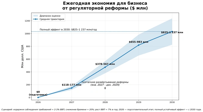 Экономический эффект комплексной реформы можно оценивать только сценарно. Если принять, что комплаенс-издержки бизнеса находятся в диапазоне 2−3% ВВП, то при ВВП в $147 млрд снижение этого бремени лишь на 20% означало бы выигрыш бизнеса 590−880 млн долларов в год.