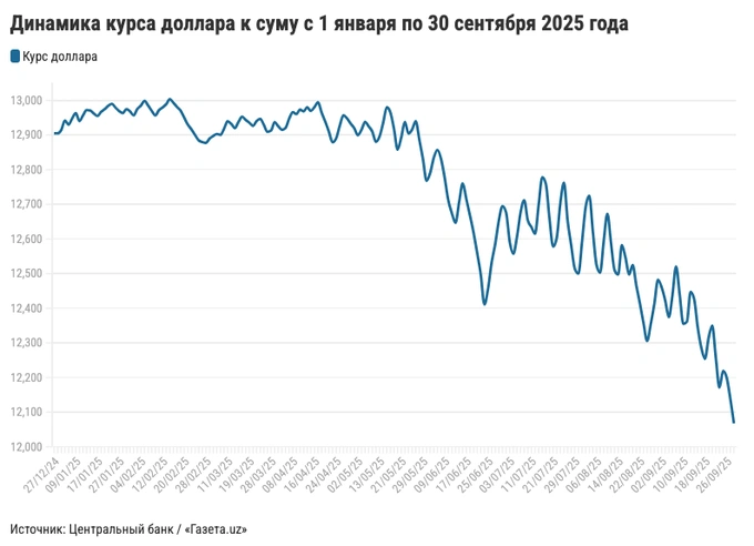 С 1 января национальная валюта укрепилась уже на 6,49% (837 сумов) — с 12904,9 до 12067,76 сума за доллар. Для сравнения, за девять месяцев 2024 года сум, напротив, ослаб на 3% (-376,65 сума), а в 2023-м — на 8,46% (-949,61 сума).