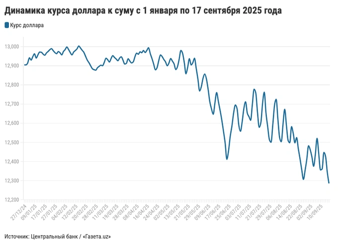 С 1 января национальная валюта укрепилась уже на 4,8% (почти 620 сумов) — с 12904,9 до 12285,16 сума за доллар. Для сравнения, в тот же период 2024 года сум, напротив, ослаб на 3,2% (-390,7 сума), а в 2023-м — на 8,3% (-928,56 сума).