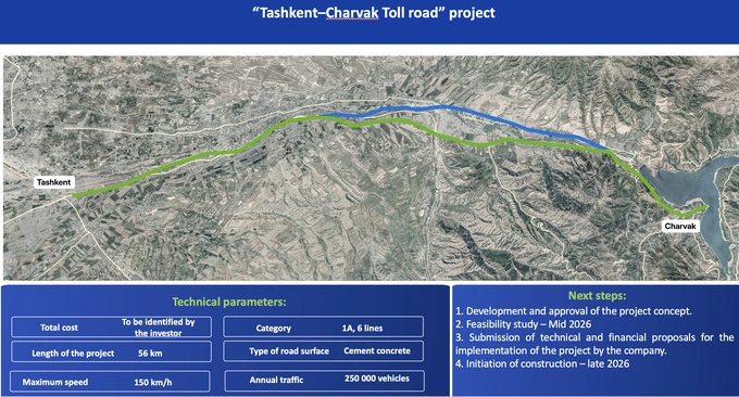 Заместитель министра транспорта Жасурбек Чориев рассказал о разработке проекта платной автомобильной дороги между Ташкентом и Чарваком. Презентация (есть у «Газеты») была сделана 19 ноября на третьем круглом столе по государственно-частному партнёрству.