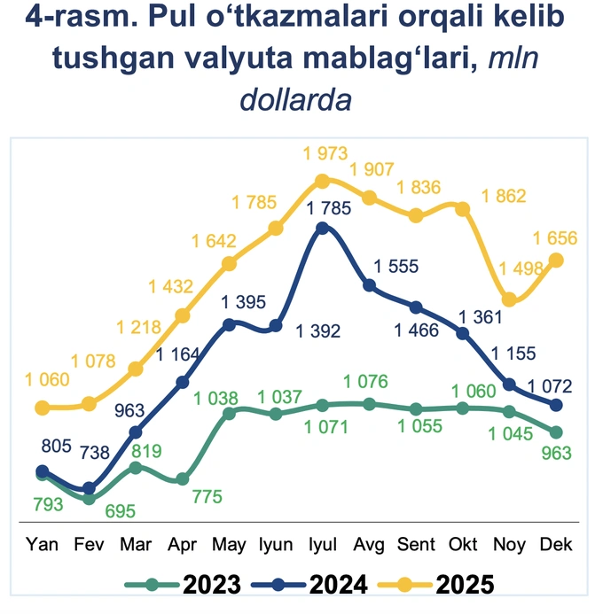 Через международные денежные переводы в страну поступило 18,9 млрд долларов — на 28% больше, чем годом ранее. Отток валютных средств из страны составил 2,6 млрд долларов, что на 138 млн долларов меньше по сравнению с 2024 годом.