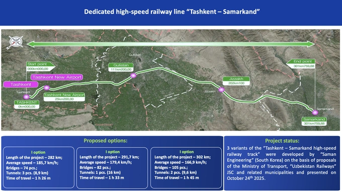 Президент Шавкат Мирзиёев в сентябре прошлого года сообщал о планах по строительству новой железной дороги по маршрутам «Ташкент — Самарканд» и «Самарканд — Навои — Бухара» для движения высокоскоростных поездов.