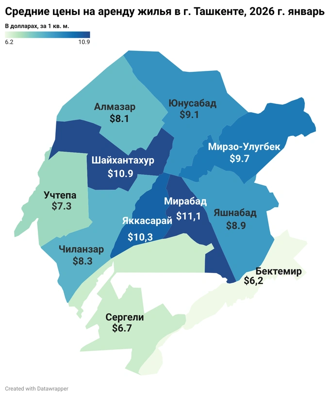 Самые высокие арендные ставки сохраняются в центральных районах — Мирабадском, Шайхантахурском, Яккасарайском и Мирзо-Улугбекском, где средняя цена достигает около 11 долларов за кв. м.