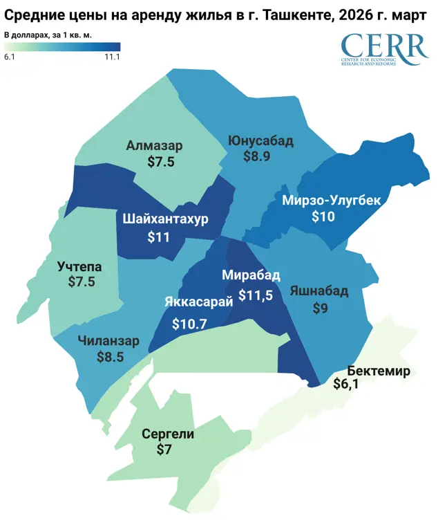 Самые высокие ставки сохраняются в центральных районах — Мирабадском, Шайхантахурском, Яккасарайском и Мирзо-Улугбекском (около 11 долларов за кв. м).