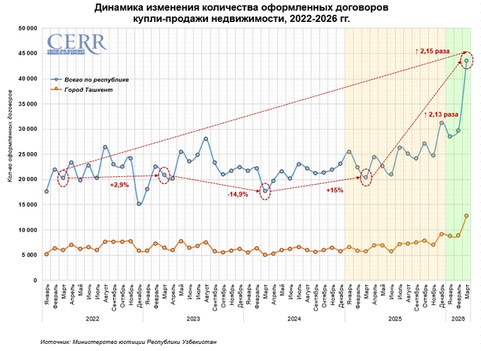 В Узбекистане в марте 2026 года зафиксирован резкий рост активности на рынке недвижимости. Об этом говорится в обзоре Центра экономических исследований и реформ (ЦЭИР).