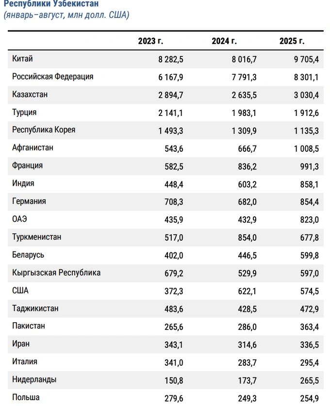 Китай остаётся крупнейшим партнёром Узбекистана — оборот составил 9,7 млрд долларов, что на 21% больше, чем в 2024 году. Россия заняла второе место с показателем $8,3 млрд (+6,5%). Казахстан восстановил позиции после падения прошлого года и достиг $3 млрд (+15%).