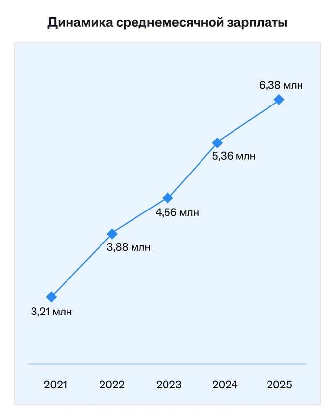 В Бухарской области среднемесячная зарплата достигла 5,09 млн сумов (+17,2%), в Сырдарьинской — 5,12 млн сумов (+20,8%), в Хорезмской — 5,05 млн сумов (+18,4%), а в Республике Каракалпакстан — 5,0 млн сумов (+15,7%).