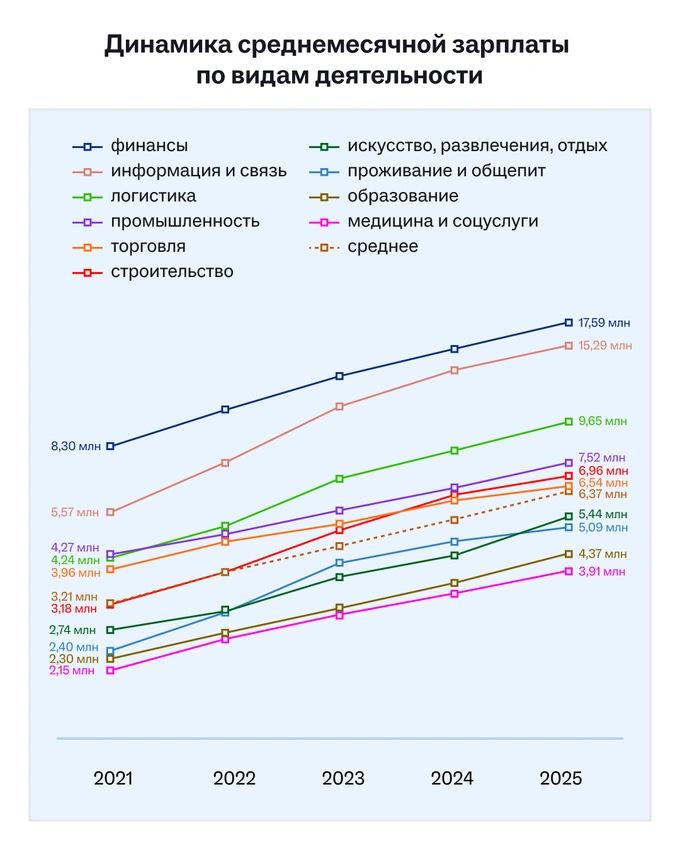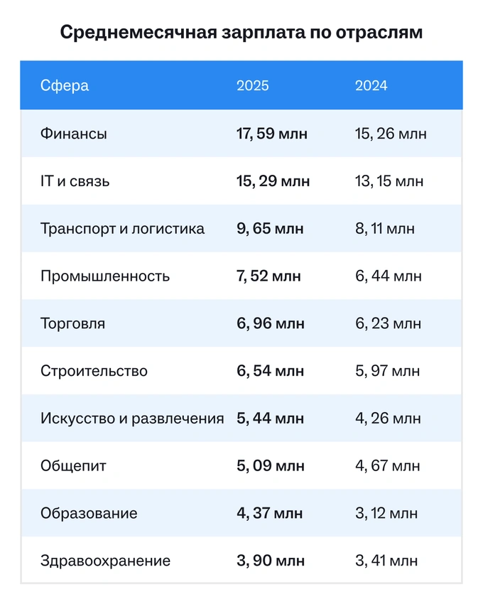 Наиболее высокая средняя зарплата сохраняется в финансовом секторе (банковская, страховая, лизинговая, кредитно-посредническая деятельность) — 17,6 млн сумов (+15,2%), а также в сфере IT и связи — 15,3 млн сумов (+15,8%), а самые низкие — в сфере здравоохранения (3,9 млн сумов, +14,5%).