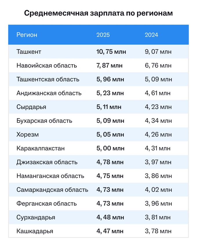 Наибольшая средняя зарплата зафиксирована в Ташкенте — 10,75 млн сумов, что на 18,3% выше уровня прошлого года. После столицы самые высокие показатели зафиксированы в Навоийской области — 7,87 млн сумов, что на 16% выше уровня 2024 года.