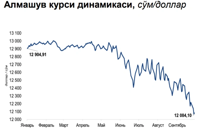 Однако, как отмечает экономист Миркомил Холбоев, в августе РЭОК обесценился на 3,9% по сравнению с началом года. Это означает, что в сентябре произошло заметное укрепление реального курса.
