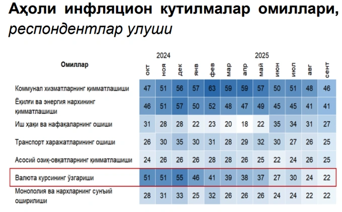 «В течение отчётного периода российский рубль укрепился по отношению к доллару на 27%, китайский юань — на 2,5%, корейская вона — на 5%, тогда как тенге подешевел на 4,6%. Это, в свою очередь, способствовало сохранению конкурентоспособности Узбекистана на внешнем рынке», — отмечается в обзоре.