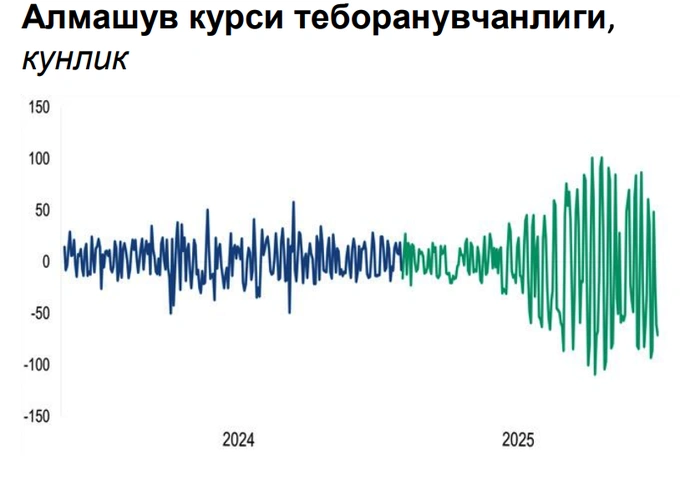 С апреля суточная волатильность курса сум/доллар выросла в два раза, приблизившись к средним показателям стран с плавающим валютным курсом. Среднегодовая волатильность курса, рассчитанная на основе ежедневных изменений курса сума, также приблизилась к уровню стран с гибкой валютной политикой.