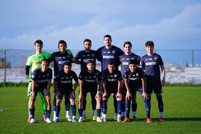 Футболисты клуба «Бунёдкор» в экипировке с надписью «Узбекнефтегаз», февраль 2026 года. Реклама на Gazeta