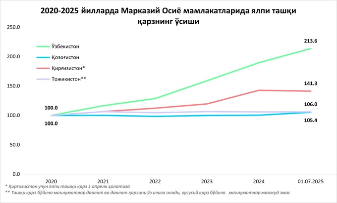 Для сравнения: за тот же период внешний долг Кыргызстана увеличился на 41,3%, а в Казахстане и Таджикистане — на 5,4% и 6% соответственно.