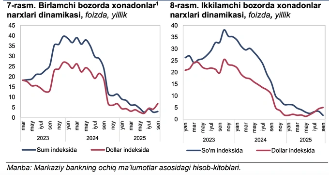 В ценовой динамике существенных изменений не зафиксировано: цены формировались на уровне средних значений предыдущих кварталов. На фоне укрепления национальной валюты годовой рост цен на жильё в долларовом выражении ускорился, тогда как в сумах сохранялась прежняя динамика.