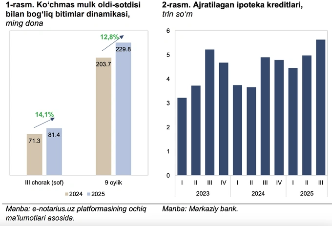 Рынок недвижимости Узбекистана в третьем квартале 2025 года сохранял высокий уровень активности на фоне роста числа сделок, ипотечного кредитования, доходов населения и строительных работ. Об этом говорится в обзоре Центрального банка.