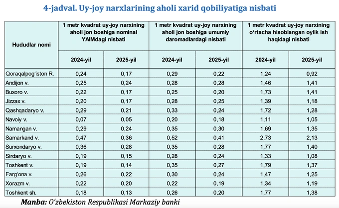 Наиболее наглядна ситуация в Ташкенте. В 2025 году соотношение цены 1 кв. м (14,9 млн сумов) к средней месячной зарплате (10,7 млн сумов) составило 1,38 — против 1,77 в 2024 году. Это существенное улучшение за один год.