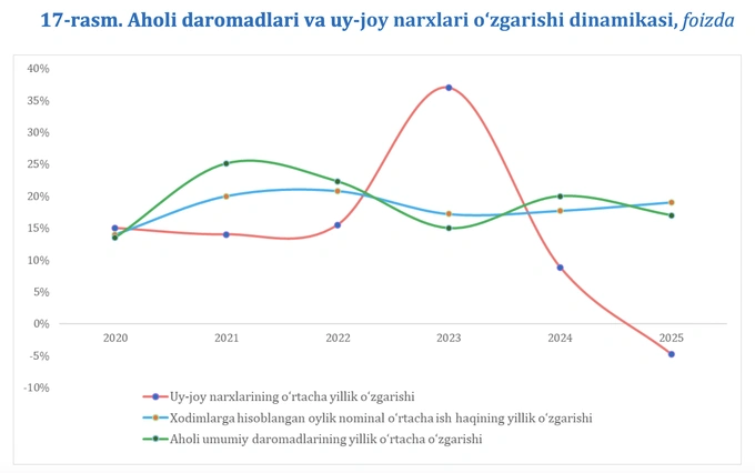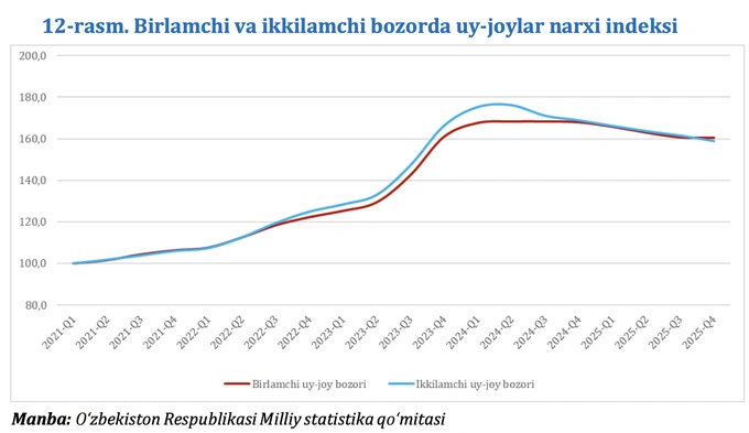 Центробанк связывает стабилизацию рынка и с активной государственной поддержкой строительства. В 2025 году на строительные работы по республике было направлено 313,9 трлн сумов — на 14,2% больше, чем годом ранее.