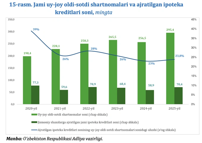Доля сделок, совершённых с использованием ипотеки, выросла до 23,8% против 23% годом ранее. Наиболее высокая доля ипотечных сделок зафиксирована в Сурхандарьинской области — 37,8%, Навоийской — 35,3% и Кашкадарьинской — 33,3%.
