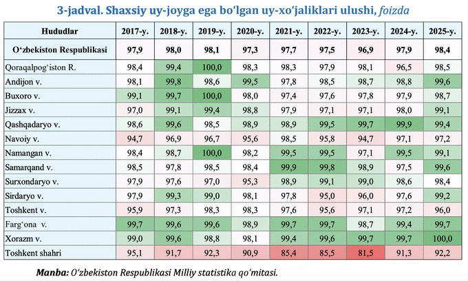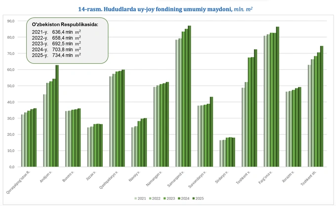 По состоянию на 1 января 2026 года общий жилищный фонд страны достиг 734,4 млн кв. м — на 4%, или на 30,6 млн кв. м больше, чем годом ранее. Самые высокие показатели зафиксированы в Самаркандской области — 87 млн кв. м, Ферганской — 86,4 млн кв. м и в Ташкенте — 74,5 млн кв. м.