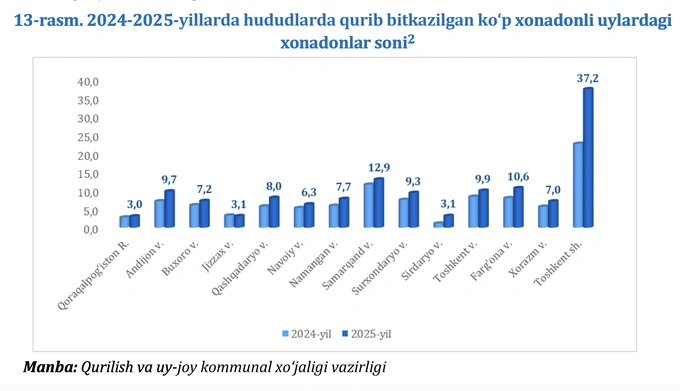 Одной из главных причин замедления цен ЦБ называет заметный рост предложения. В 2025 году число квартир в завершённых многоквартирных домах достигло 135 тысяч, что на 35 тысяч больше, чем годом ранее. Наибольшие объёмы пришлись на Ташкент — 37,2 тысячи квартир, Самаркандскую область — 12,9 тысячи и Ферганскую область — 10,6 тысячи.