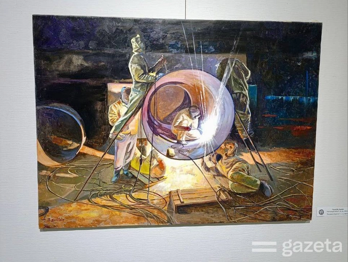Зайнитдин Аскаров, яркий представитель поколения пятидесятилетних, использует традицию иначе: через индустриальный образ. В его новой работе «Газовики Хорезма» свет — не просто инструмент, а логика всего изображения. Яркая вспышка сварки вырывает рабочие фигуры из тьмы, превращая их в почти скульптурные формы. В этих работах чувствуется, как промышленный сюжет становится новым фольклором, а производственный ритм — такой же органичной частью Хорезма, как и арыки.