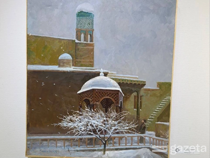 Кахрамон — противоположность. Его «Зимняя Хива» построена на сдержанных тонах. Бирюзовый минарет — единственный цветовой акцент, как память о лете. В работе удивительным образом сходятся музейная тишина и городская пауза.