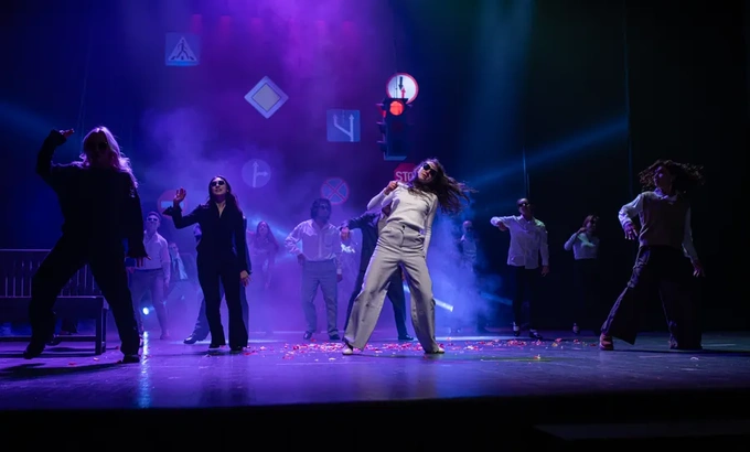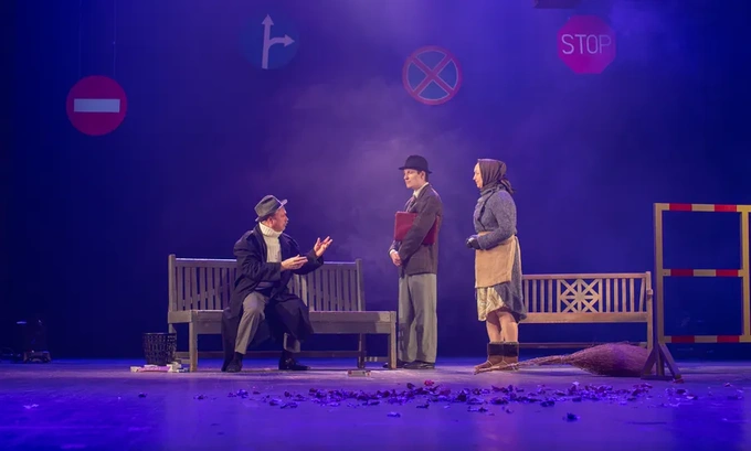 Главный режиссёр ГАРДТ Валихан Умаров открыл пьесу тем самым мелодраматическим ключом, но постарался не дать ей утонуть в сиропе. Место действия — унылый городской суд, через который проходит вереница разводящихся, — здесь обрамлено причудливой «дорожной» сценографией Сергея Чернова: автознаки и светофор, подвешенные над сценой, телефон-автомат вплотную к зрительским местам, скамейки, которые то становятся дворовыми, то судебными.