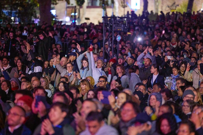 Холодный ноябрьский ветер только начал пробежку по древней площади, гостям на сидячих местах едва успели раздать тёплые пледы, как сценический дым, казалось, уже смешался с паром от стаканчиков с чаем и кофе, которыми согревались слегка подмёрзшие зрители. Установленные по всему периметру сцены 13 мониторов транслировали фрагменты средневековой мозаики так, что казались цифровыми минаретами — собратьями тех, что веками стояли по соседству.