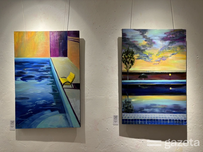 В самую раннюю серию под названием «Бассейн» вошли картины, написанные летом 2023 года. Для художницы это было время возвращения к себе после недавнего переезда из Санкт-Петербурга, где остались дом и закрытая мастерская. Прежняя жизнь ещё не отпустила, а новая пугала. Созерцание воды, её блеска и мерного движения стало способом не утонуть в тревоге: вода напоминала вид на Балтийское море в окне прежней мастерской и помогала постепенно осваивать новое пространство — сначала дом, затем улицу, потом город и, наконец, людей, которые незаметно входили в её жизнь и помогали укореняться.