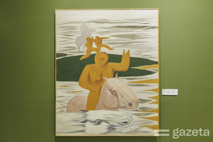 Неизбежные переклички с историей искусства Зелимхан Саиджанов использует как рабочий инструмент, а не как повод для цитаты. «Купание коня» вступает в диалог с известным полотном Кузьмы Петрова-Водкина. Однако художник переосмысливает этот символ, убирая революционную яркость и добавляя восточную созерцательность в пастельных тонах.