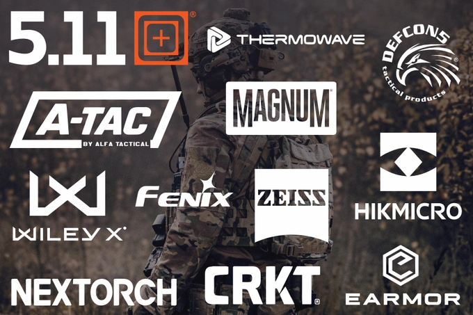 • 5.11, Carinthia, HAIX, ZEISS Sport Optics, Wiley X, Nextorch, Hikmicro, Defcon 5, Fox Knives, Garrett, Magnum, Thermowave, Fenix, CRKT, Earmor и других.