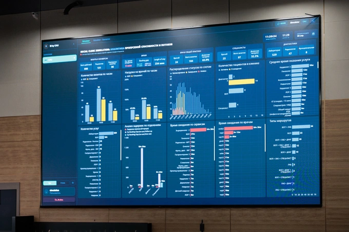 Все процессы оцифрованы. Данные управляются и анализируются через специально разработанную IT-инфраструктуру и единый центр управления, созданный специально под проект симуляции. В режиме реального времени отслеживаются ключевые показатели эффективности, включая время ожидания, загрузку специалистов, движение пациентов и эффективность маршрутов. Это даёт возможность не только оценивать устойчивость будущей модели, но и выявлять практические инсайты для организации работы диагностического центра Social.