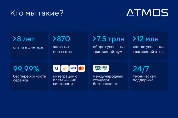 ATMOS — платёжная организация, предоставляющая решения интернет-эквайринга, онлайн-платежей и выплат для интернет-магазинов, онлайн-сервисов, мобильных приложений, маркетплейсов, образовательных платформ, таксопарков, авиакасс и других цифровых продуктов.
